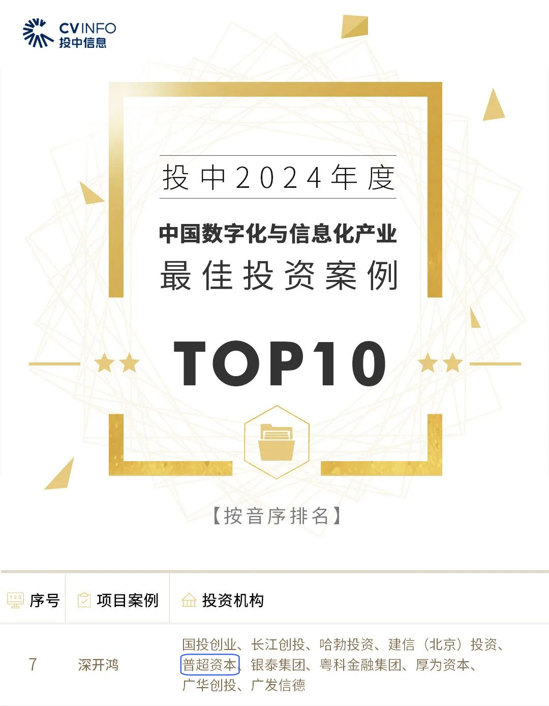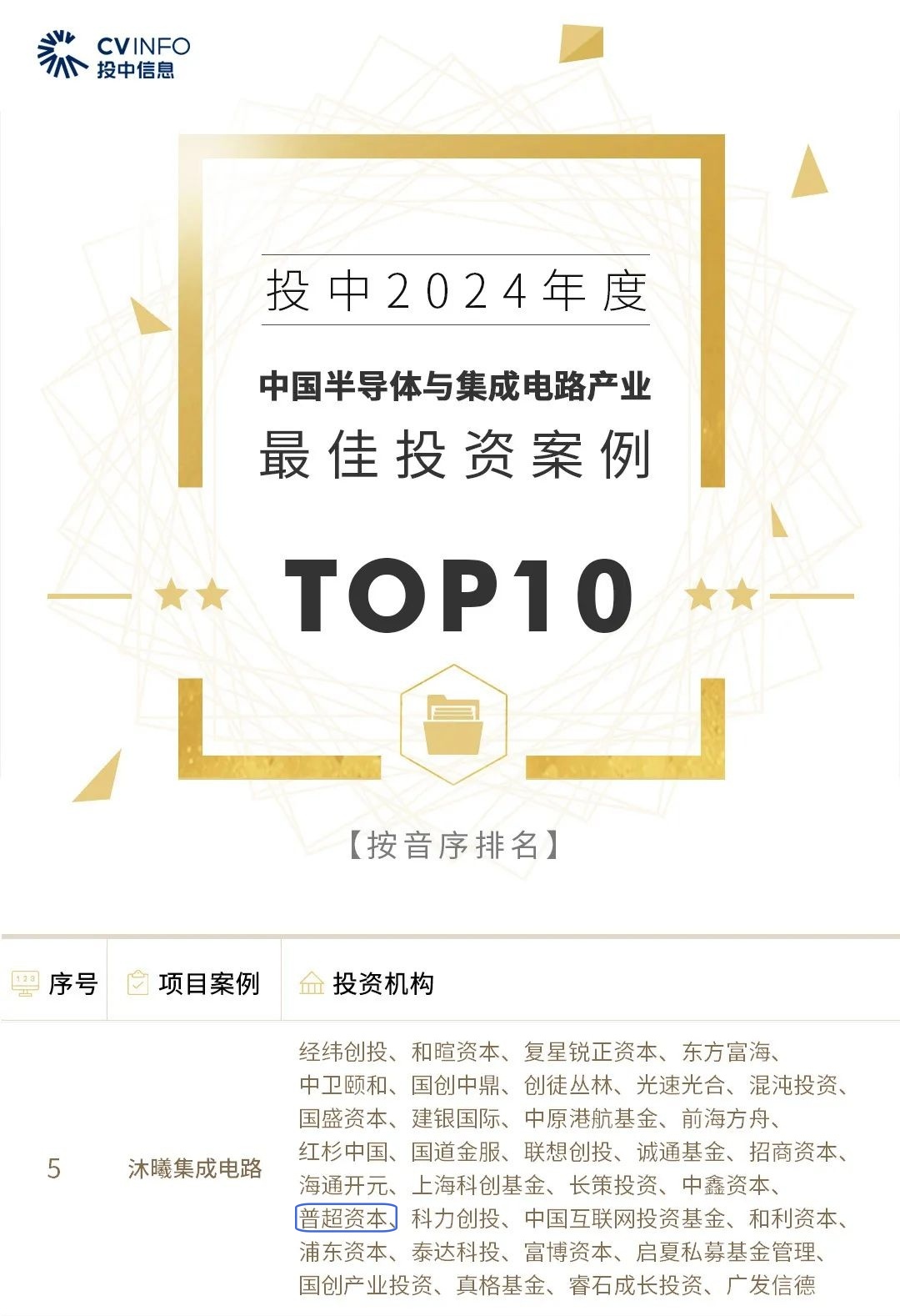 2025年4月,投中研究院权威发布“2024年度最佳投资案例”榜单。普超资本在半导体与数字信息化领域的两项战略投资获得行业认可。