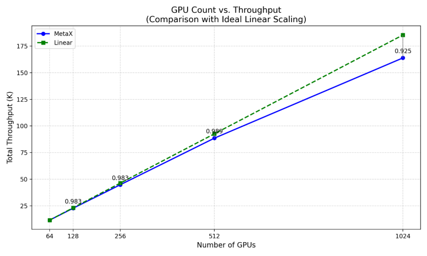 siiRL框架在沐曦超节点集群上实现了从64卡到1024卡的稳定扩展,系统保持了超过92%的高线性度拓展效率。在模型精度上,与国际主流生态 GPU的训练结果相比,沐曦超节点集群在验证集上的平均绝对误差控制在0.5%以内,满足实际应用场景的精度要求。