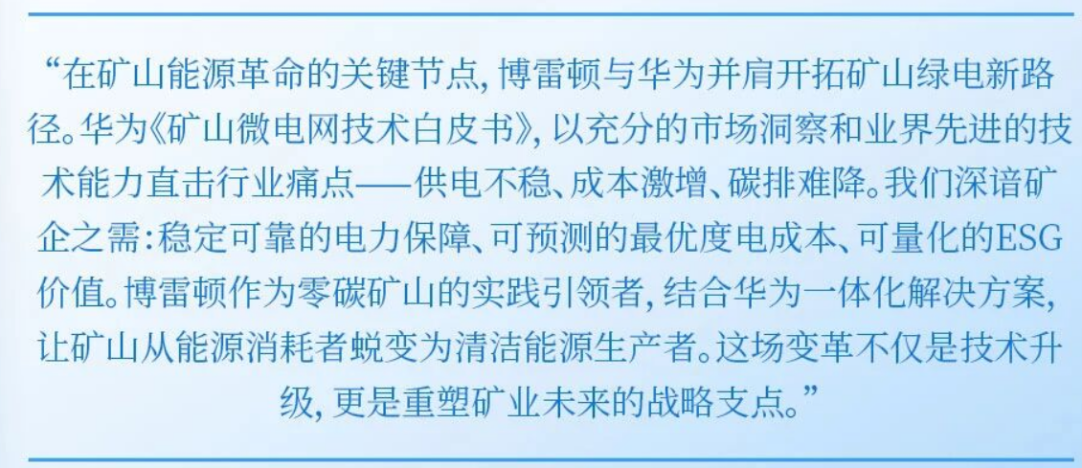 10月23日,中国国际矿业大会召开,其中华为承办“矿山智能微网发展论坛”并在现场发布《智能微网解决方案技术白皮书(矿山场景)》。这份白皮书由华为、中国矿业联合会及华东勘测设计研究院联合主编,博雷顿董事长陈方明受邀为其作序。