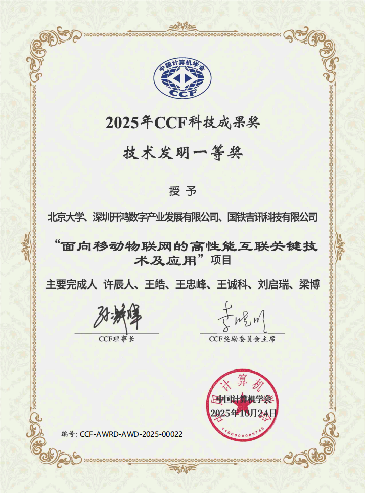 2025年10月24日,在中国计算机学会(CCF)主办的2025中国计算机大会(CNCC 2025)颁奖典礼上,正式揭晓了2025年度“CCF科技成果奖”评选结果,由深开鸿联合北京大学、国铁吉讯公司共同完成的“面向移动物联网的高性能互联关键技术及应用”荣获了CCF技术发明一等奖。深开鸿高级副总裁、研发体系总裁王皓博士为该成果的第二完成人。