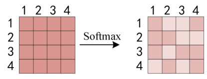 - 转化为概率分布(每一行之和都为1):Attention_Weights=Softmax(Score)。第i行、j列的数字大小表示了第i个词和第j个词的关联度