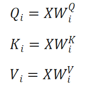 - 线性变换:对于8个头中的每一个头i(i=1,2,…,8),都有对应的权重矩阵WiQ、WiK、WiV,维度为dmodel×dk(其中dk=dmodel/8),将Xinput分别乘以三个权重矩阵: